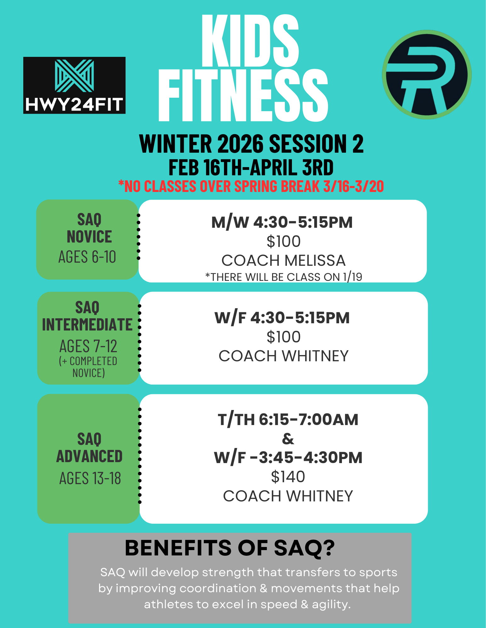 Our Youth Fitness Program—also known as SAQ (Strength, Agility & Quickness)—is designed to help kids and young athletes develop athleticism, coordination, and confidence in a fun, high-energy environment. Classes are age-appropriate and structured to meet each kids individual needs.